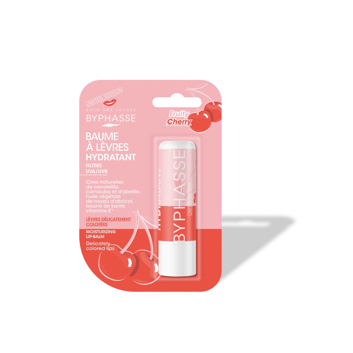 بام لب گیلاس BYPHASSE (لیمیتد) ، مرطوبکنندهای مغذی با رایحه شیرین گیلاس و ترکیبات طبیعی است که لبها را نرم، لطیف و محافظتشده نگه میدارد.